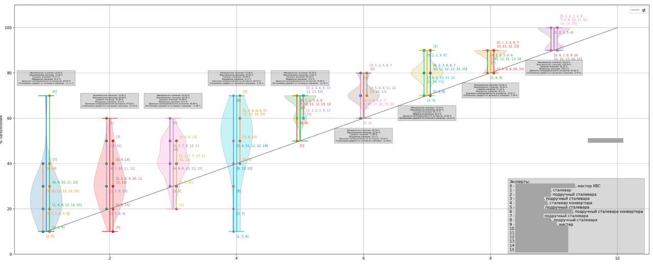 На каждом шаге фигура — это распределение мнений сталеваров об уровне. Ширина «талии» говорит о множестве идентичных мнений, а высота — об их разбросе. По этим данным видно, что при низком и среднем уровне наполнения (10-70%) сталевары сильно завышают оценку, а вот при почти полном ковше (80-100%) их мнения совпадают, а ошибки незначительны.